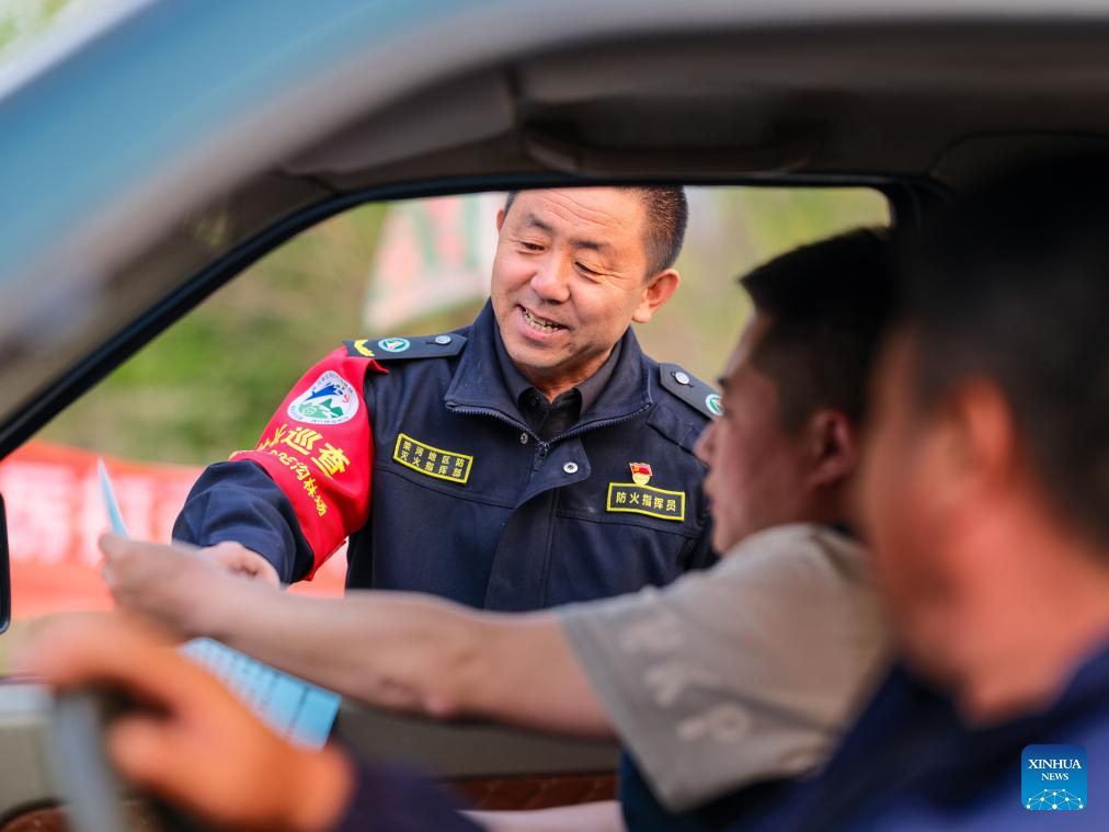 Forest ranger Yang Lijun educates motorists on wildfire prevention at Baimaogou Forest Farm in Zhalantun City, north China's Inner Mongolia Autonomous Region, May 20, 2025.(Xinhua/Ma Jinrui)