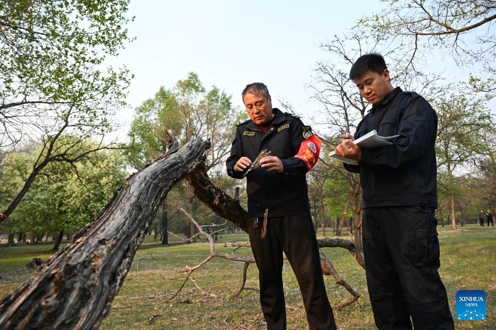 Forest ranger Cao Haihong (L) and his colleague record a naturally-dead Amur Cork-tree, a second-class protected plant in China, at Baimaogou Forest Farm in Zhalantun City, north China's Inner Mongolia Autonomous Region, May 20, 2025. (Xinhua/Bei He)