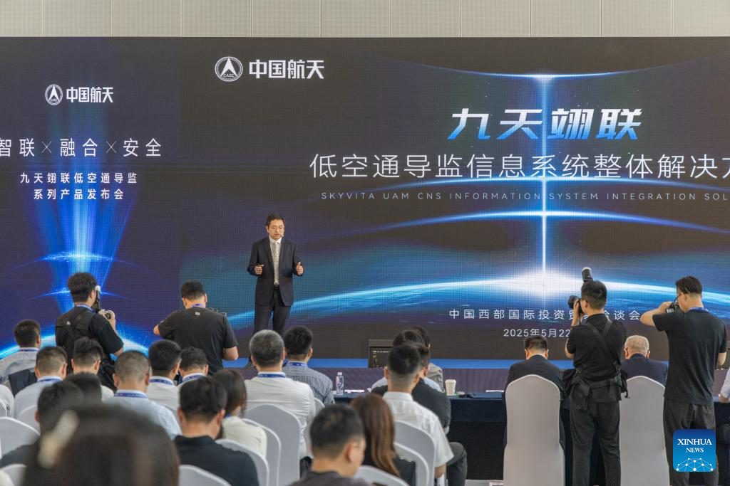 A release event of a product related to low-altitude industry is held at the 7th Western China International Fair for Investment and Trade in southwest China's Chongqing Municipality, May 22, 2025. The 7th Western China International Fair for Investment and Trade kicked off in southwest China's Chongqing Municipality on Thursday. Various products related to low-altitude economy attracted the attention of visitors at the fair. (Xinhua/Huang Wei)
