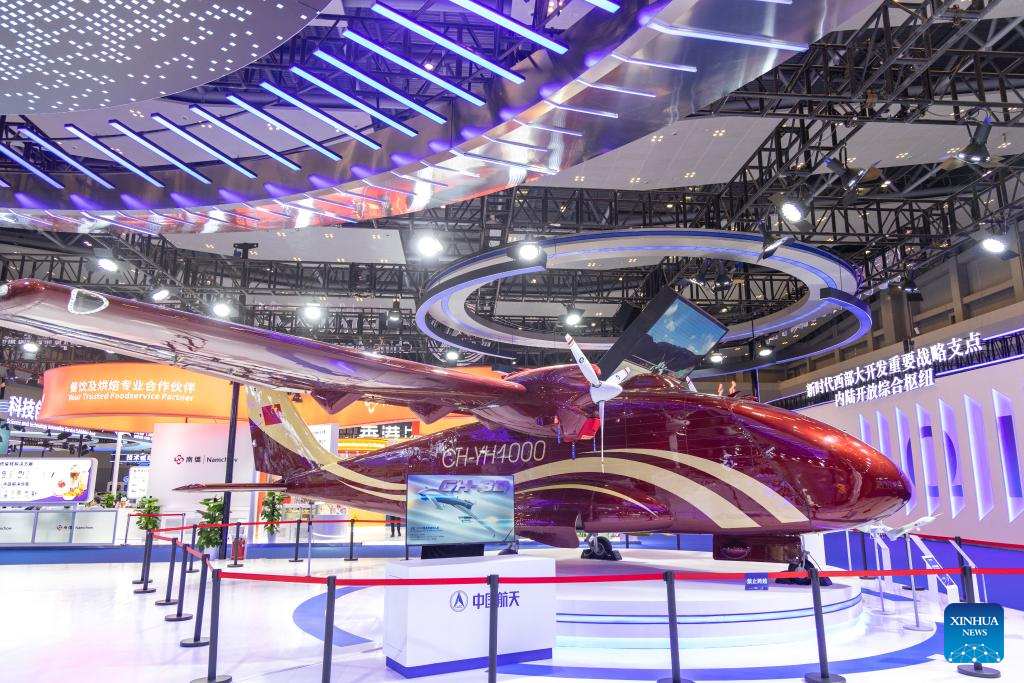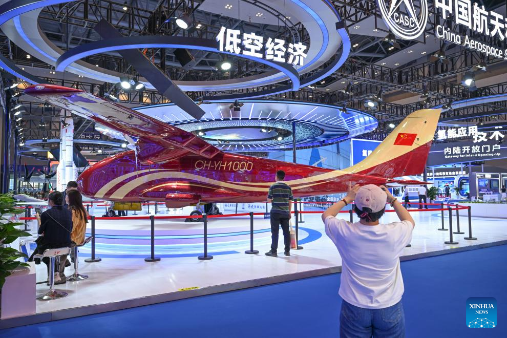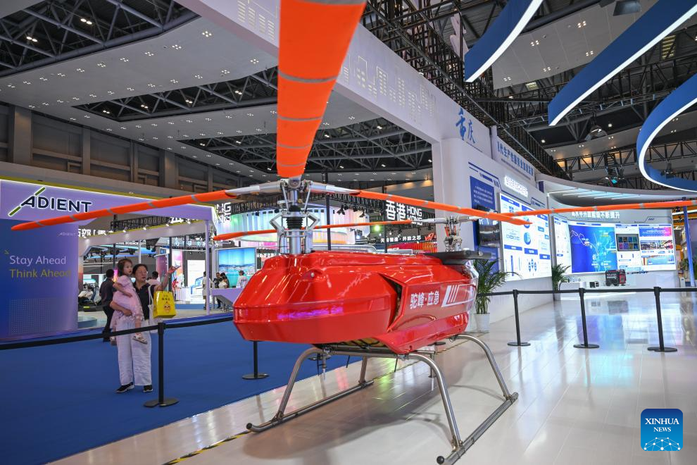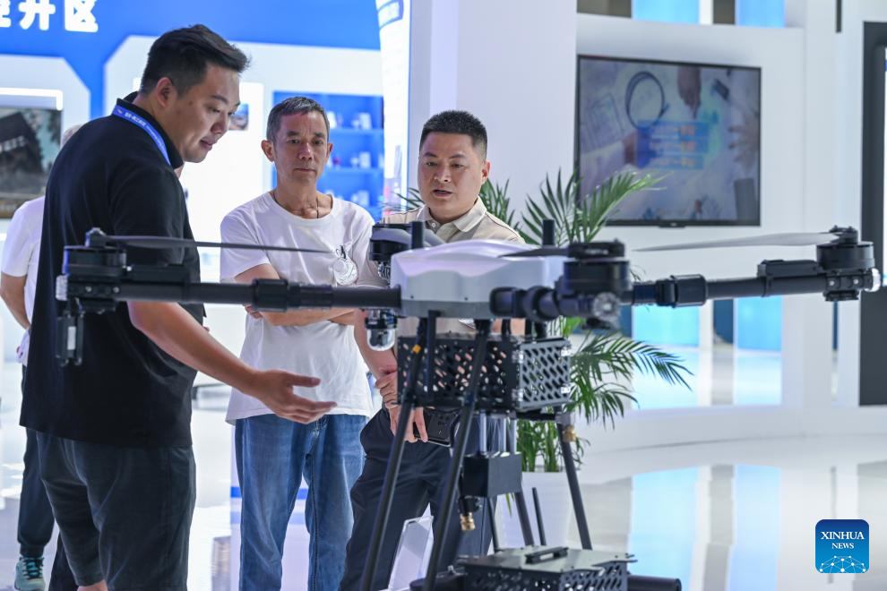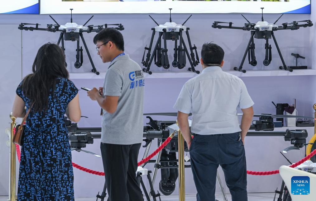 People look at drones at the 7th Western China International Fair for Investment and Trade in southwest China's Chongqing Municipality, May 23, 2025. The 7th Western China International Fair for Investment and Trade kicked off in southwest China's Chongqing Municipality on Thursday. Various products related to low-altitude economy attracted the attention of visitors at the fair. (Xinhua/Chen Cheng)
