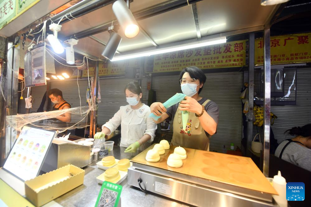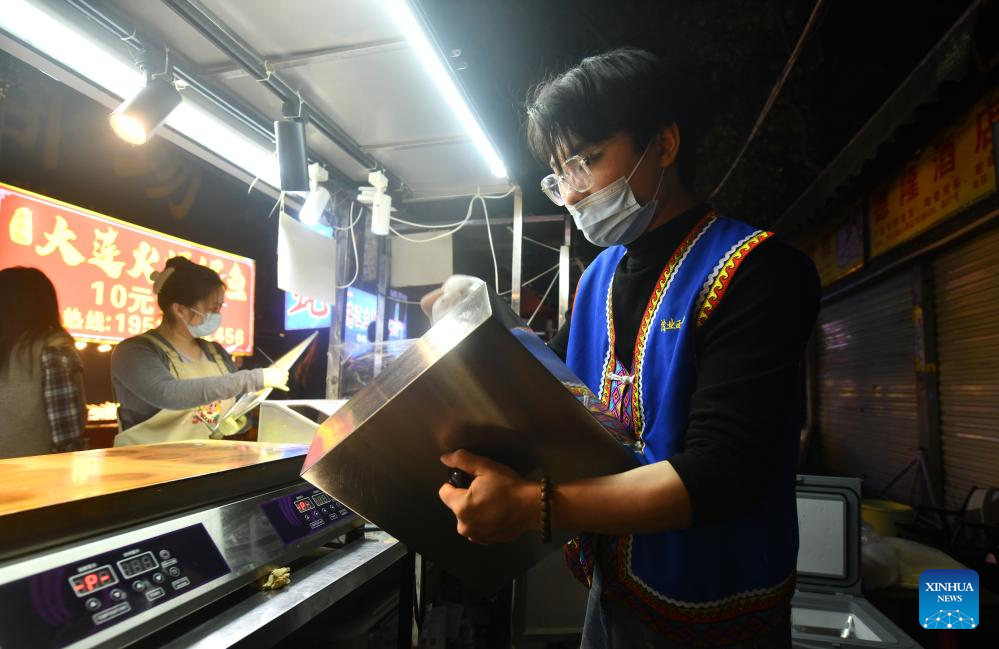 Lu explains that night market offers them an ideal starting point for small business, with steady customer flow and profits. The young couple see this venture as the first step toward their business success. (Xinhua/Huang Xiaobang)