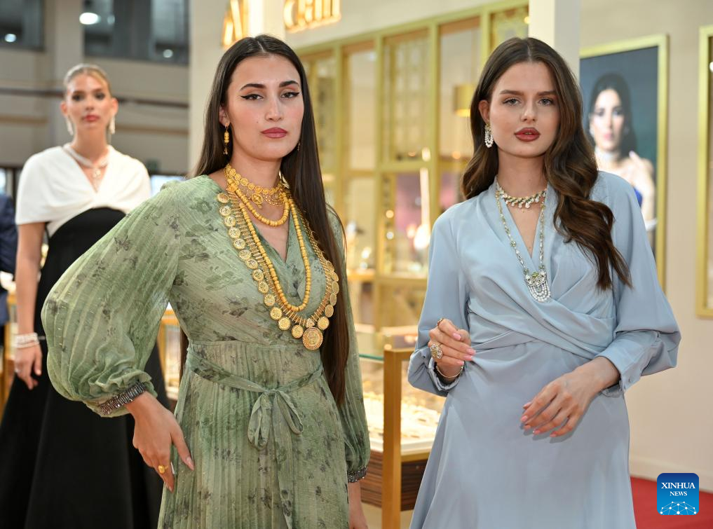 Women display jewelry at the 23rd International Gold and Jewelry Exhibition in Hawalli Governorate, Kuwait, on May 21, 2025. (Photo by Asad/Xinhua)