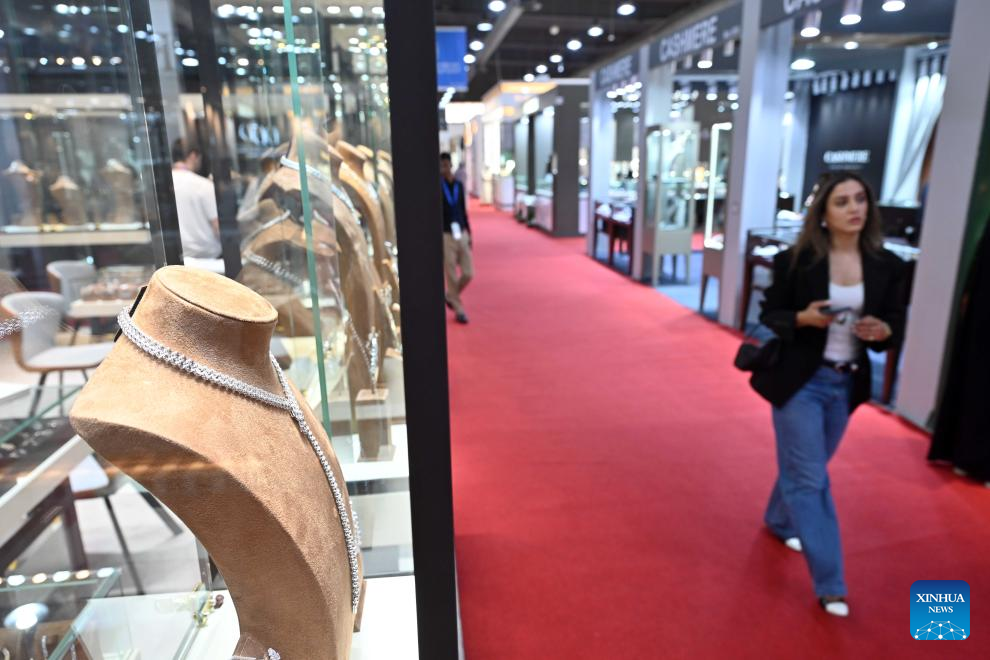 A woman visits the 23rd International Gold and Jewelry Exhibition in Hawalli Governorate, Kuwait, on May 21, 2025. (Photo by Asad/Xinhua)