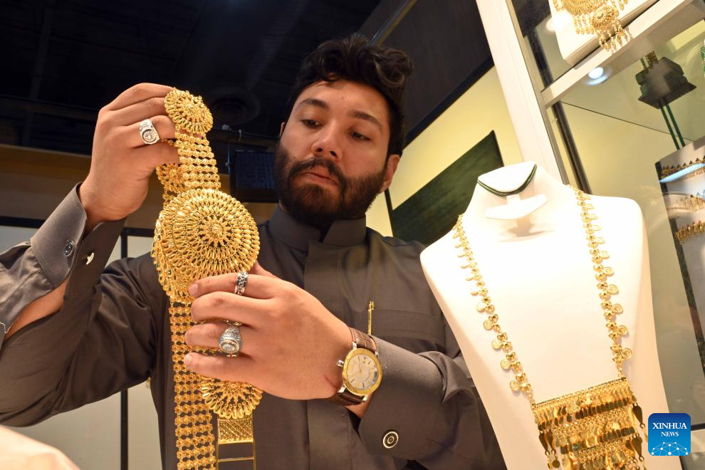 A man displays jewelry at the 23rd International Gold and Jewelry Exhibition in Hawalli Governorate, Kuwait, on May 21, 2025. (Photo by Asad/Xinhua)