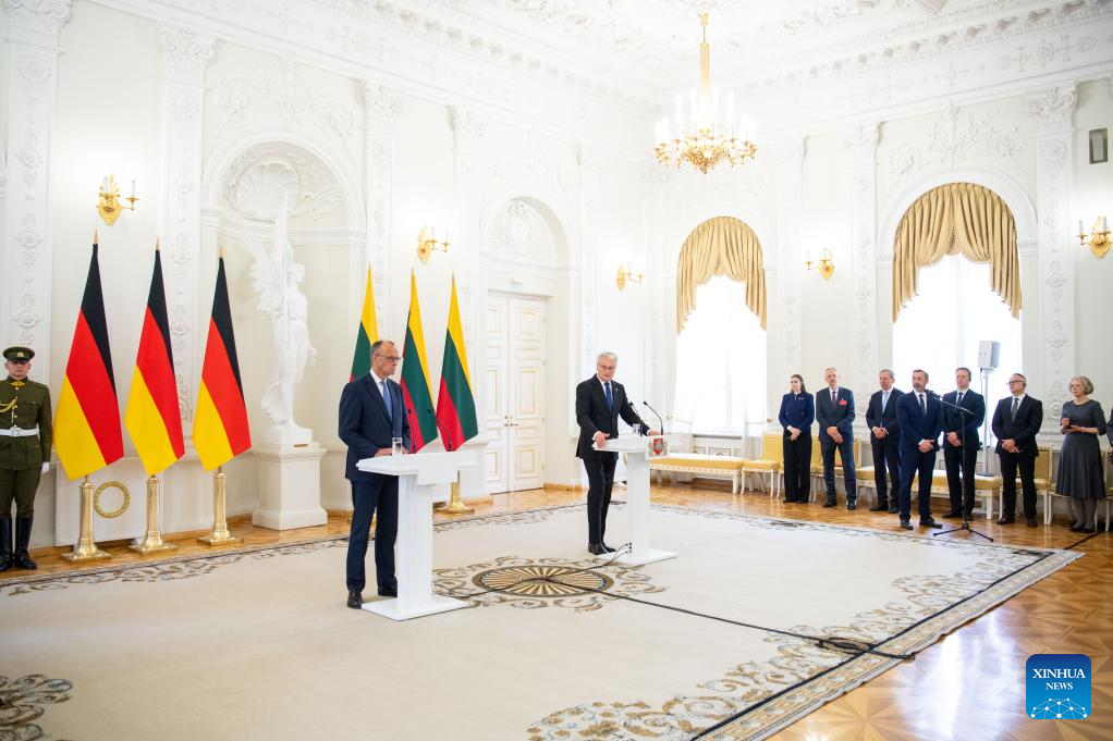German Chancellor Friedrich Merz (2nd L) and Lithuanian President Gitanas Nauseda (3rd L) attend a news conference in Vilnius, Lithuania, on May 22, 2025. (Lithuanian Presidency/Handout via Xinhua)