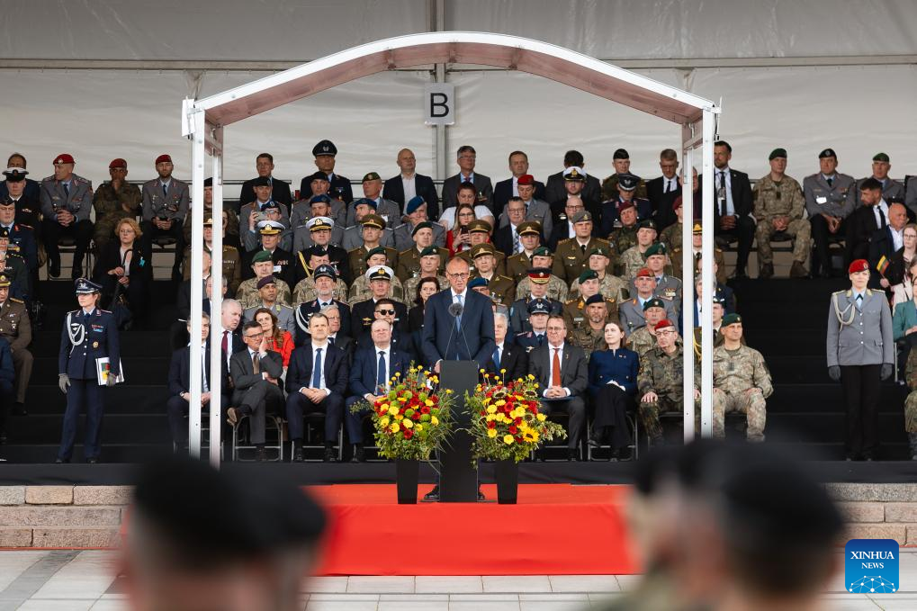 German Chancellor Friedrich Merz (Front) attends an inauguration ceremony of the German 45th Armored Brigade "Lietuva" in Vilnius, Lithuania, on May 22, 2025. (Photo by Alfredas Pliadis/Xinhua)