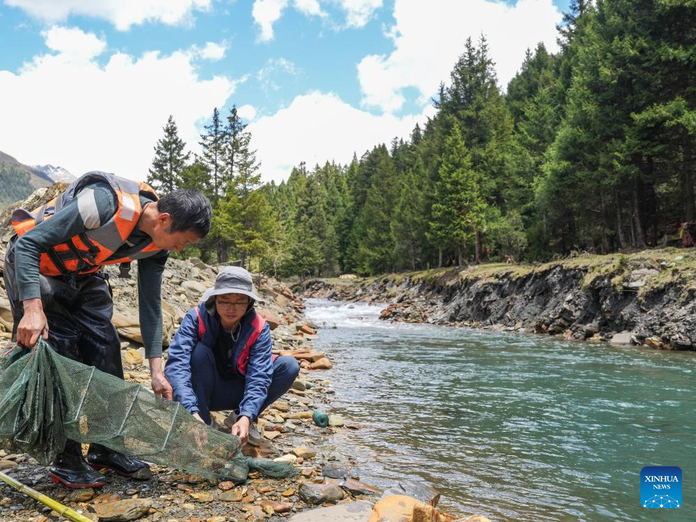 Yu Yi (R) checks newly caught fish in Songpan County of Aba Tibetan and Qiang Autonomous Prefecture, southwest China's Sichuan Province, May 20, 2025. (Xinhua/Wang Xi)