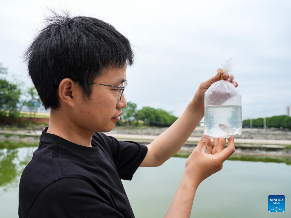 Yu Yi checks a fish he received at the Fisheries Institute of Sichuan Academy of Agricultural Sciences in Chengdu, southwest China's Sichuan Province, May 6, 2025. (Xinhua/Wang Xi)