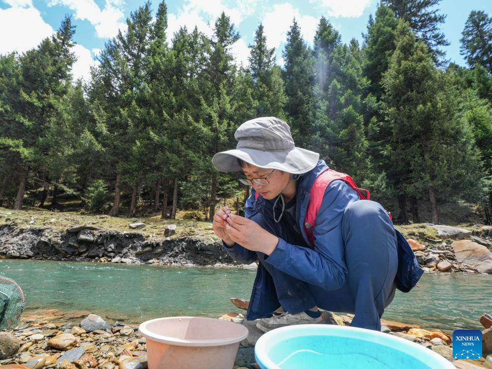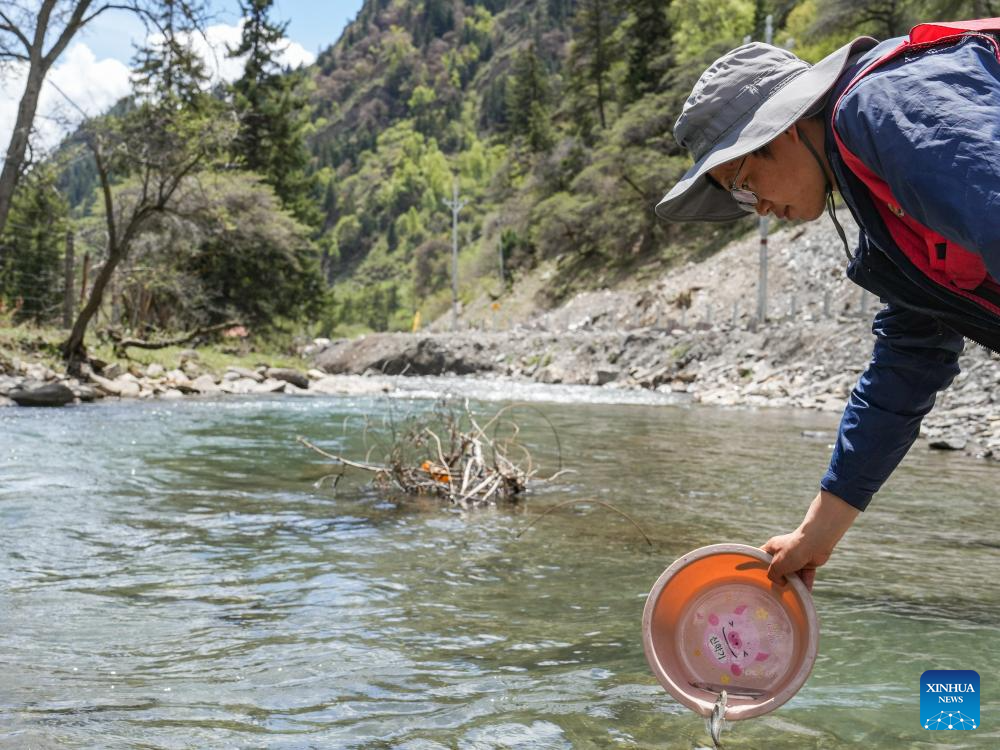 Yu Yi releases the fish he caught for research in Songpan County of Aba Tibetan and Qiang Autonomous Prefecture, southwest China's Sichuan Province, May 20, 2025. (Xinhua/Wang Xi)