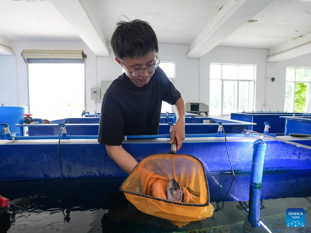 Yu Yi checks the condition of fish at the Fisheries Institute of Sichuan Academy of Agricultural Sciences in Chengdu, southwest China's Sichuan Province, May 6, 2025. (Xinhua/Wang Xi)