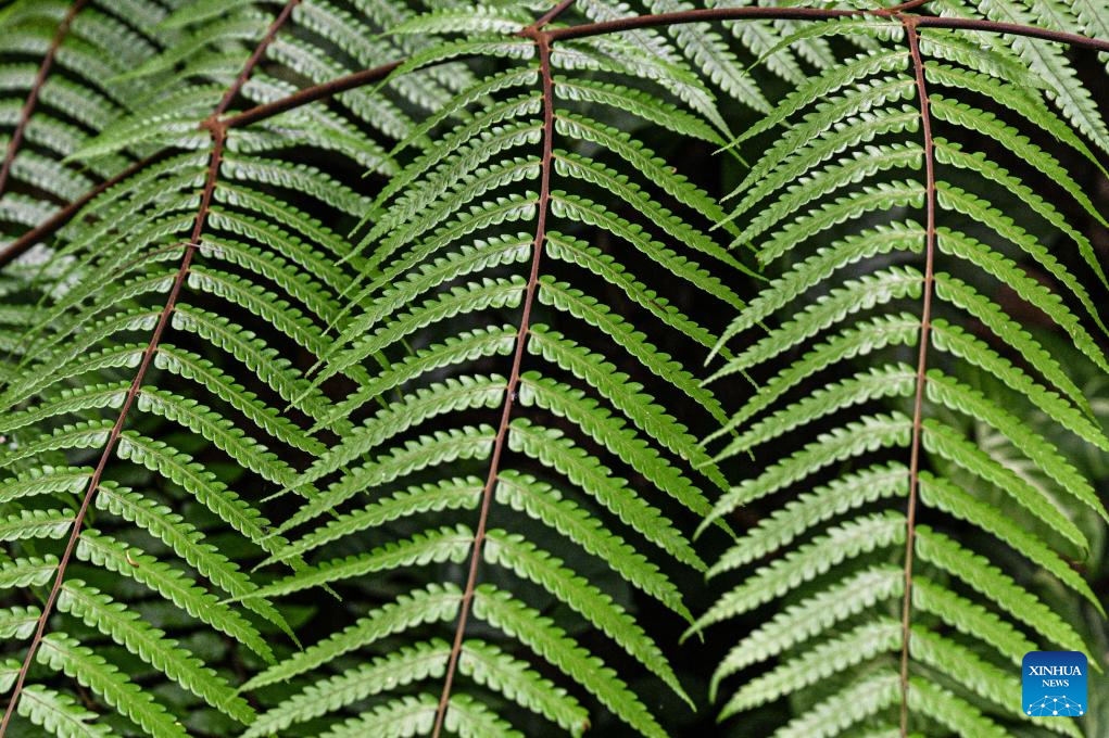 This photo taken on May 20, 2025 shows tree leaves at the Yanoda Rain Forest Cultural Tourism Zone in Baoting Li and Miao Autonomous County, south China's Hainan Province. The Yanoda Rain Forest Cultural Tourism Zone boasts over 1,400 species of trees and more than 80 varieties of tropical flowers. (Xinhua/Pu Xiaoxu)