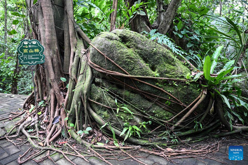 This photo taken on May 20, 2025 shows tree roots wrapping around a stone at the Yanoda Rain Forest Cultural Tourism Zone in Baoting Li and Miao Autonomous County, south China's Hainan Province. The Yanoda Rain Forest Cultural Tourism Zone boasts over 1,400 species of trees and more than 80 varieties of tropical flowers. (Xinhua/Pu Xiaoxu)
