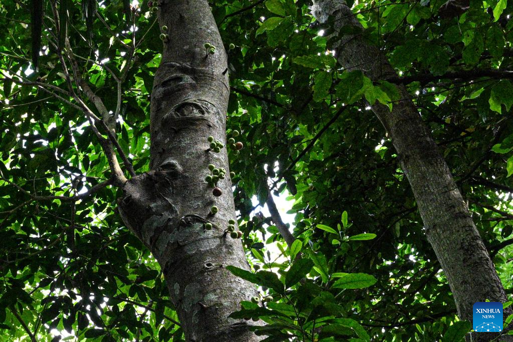 This photo taken on May 20, 2025 shows a stem bearing fruit at the Yanoda Rain Forest Cultural Tourism Zone in Baoting Li and Miao Autonomous County, south China's Hainan Province. The Yanoda Rain Forest Cultural Tourism Zone boasts over 1,400 species of trees and more than 80 varieties of tropical flowers. (Xinhua/Pu Xiaoxu)