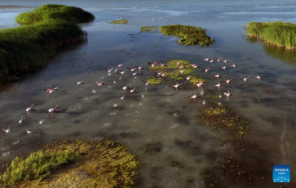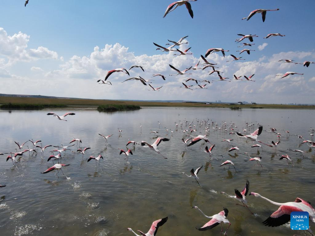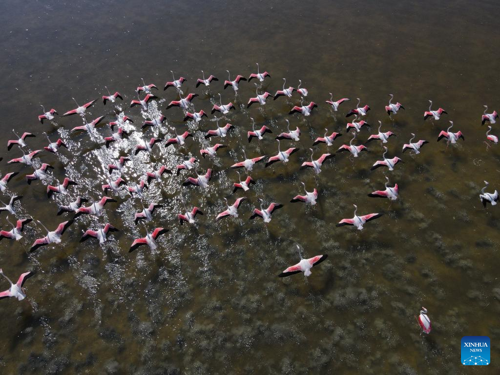 Flamingos are seen at the Sel Kapani Dam Lake in Ankara, Türkiye, May 23, 2025. (Mustafa Kaya/Handout via Xinhua)