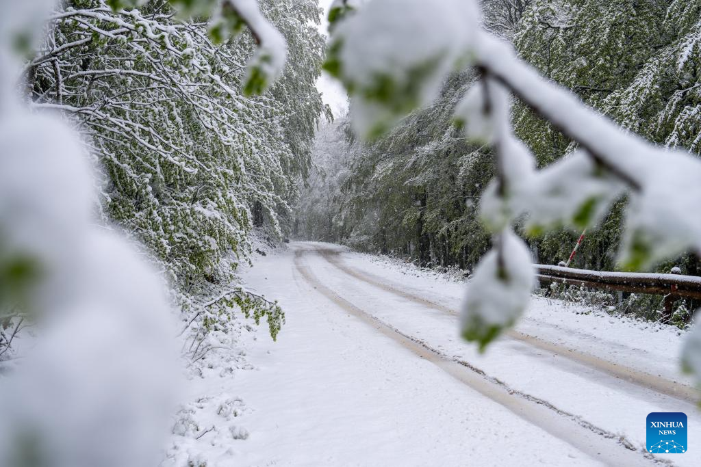 This photo shows a snowfall in the Northern Velebit National Park, Croatia, on May 23, 2025. (Hrvoje Kostelac/PIXSELL via Xinhua)