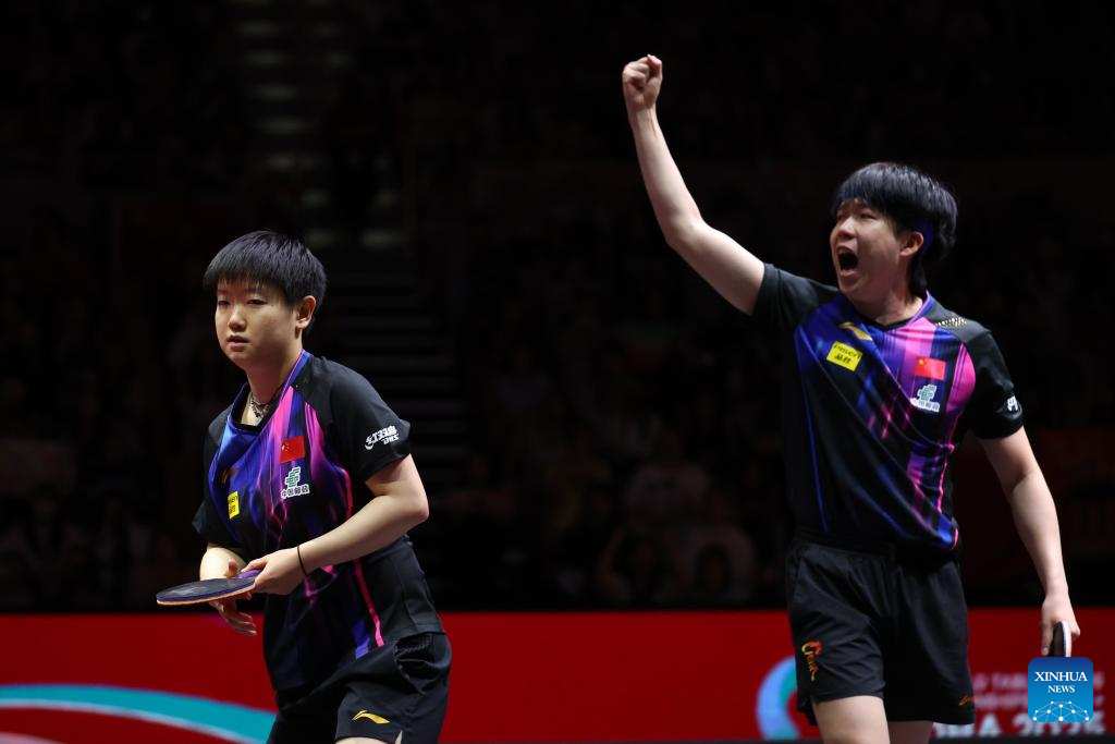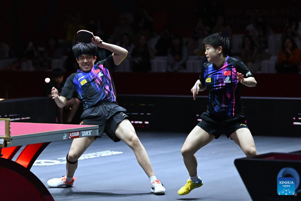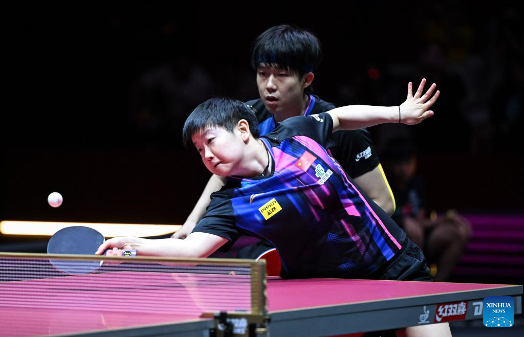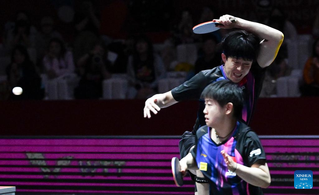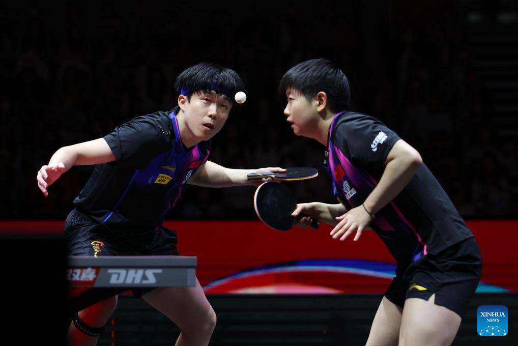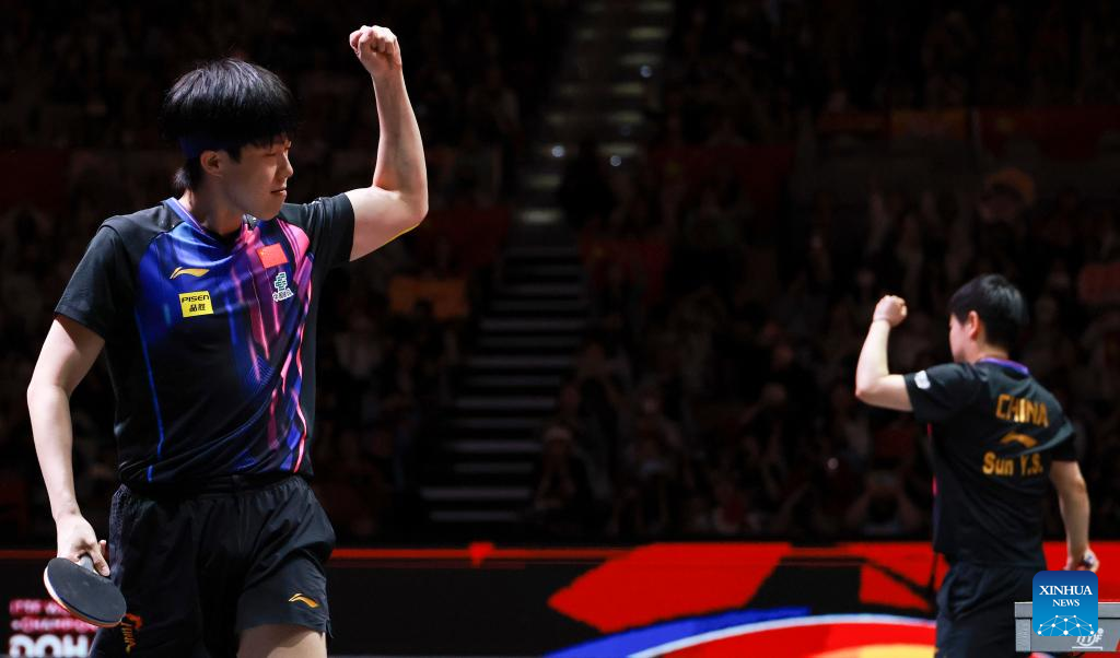 DOHA, May 24 (Xinhua) -- China's Olympic champions Wang Chuqin and Sun Yingsha defeated a Japanese team 3-1 to win their third straight mixed doubles title at the World Table Tennis Championships on Saturday.