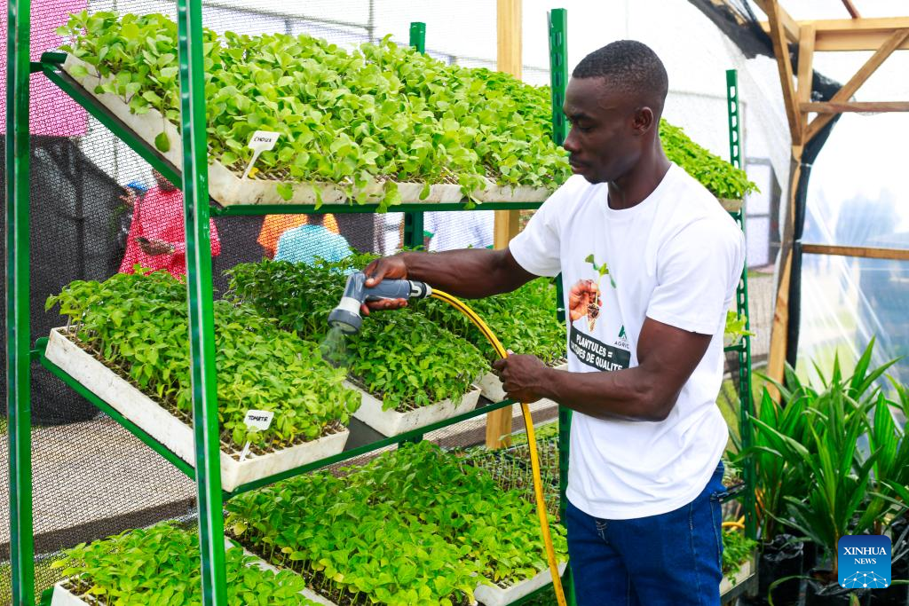 A staff member waters the vegetable seedlings on display during the 7th International Exhibition of Agriculture and Animal Resources (SARA 2025) at the Abidjan Exhibition Centre, Abidjan, Cote d'Ivoire, on May 23, 2025. (Photo by Laurent Idibouo/Xinhua)