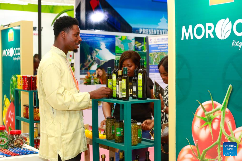 A visitor learns about the products on a Moroccan stand during the 7th International Exhibition of Agriculture and Animal Resources (SARA 2025) at the Abidjan Exhibition Centre, Abidjan, Cote d'Ivoire, on May 23, 2025. (Photo by Laurent Idibouo/Xinhua)