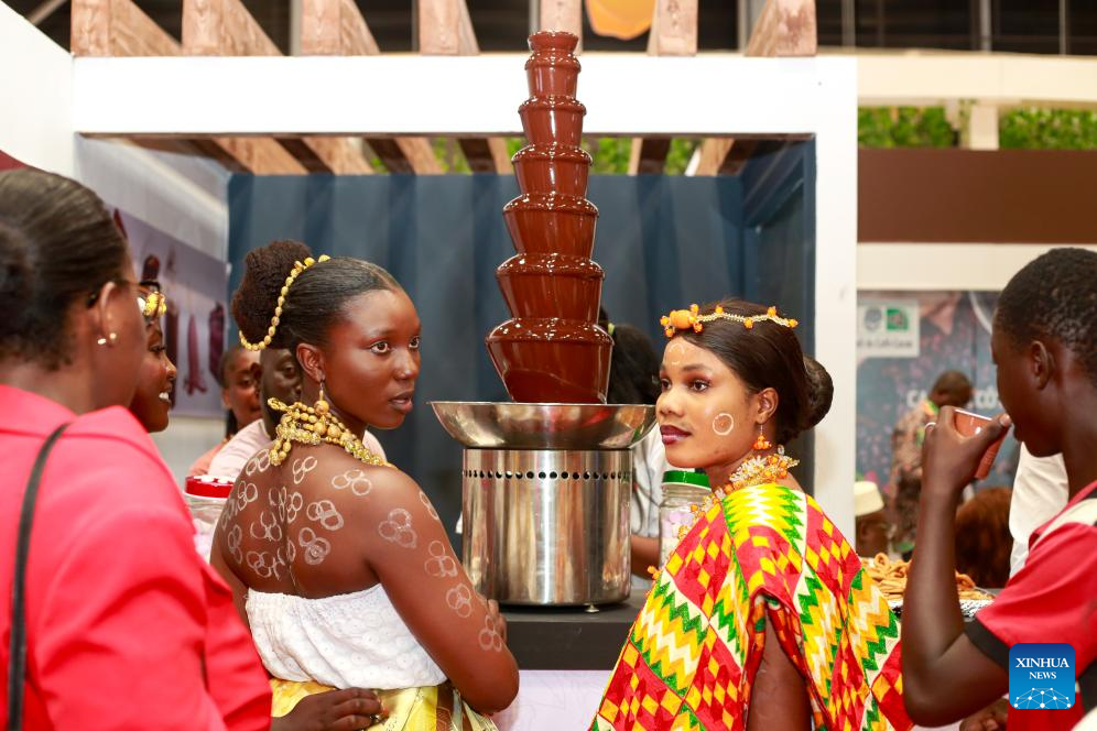 Visitors queue up to taste chocolate made from Ivorian cocoa at the 7th Abidjan International Agriculture and Animal Resources Exhibition in Abidjan, Cote d'Ivoire, May 23, 2025. (Photo by Laurent Idibouo/Xinhua)