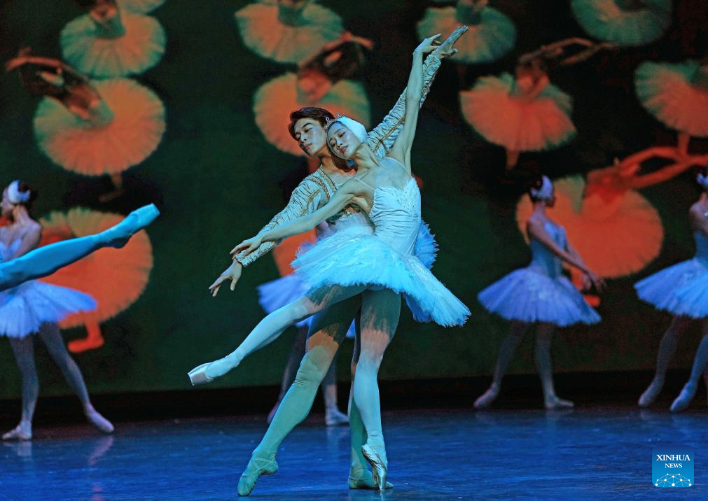 Dancers from Shanghai Ballet perform a highlight clip of Swan Lake at the Shanghai Grand Theatre in east China's Shanghai, Feb. 15, 2025. In recent years, Shanghai has been promoting the construction of key public cultural facilities and cultural landmarks with Shanghai characteristics.
