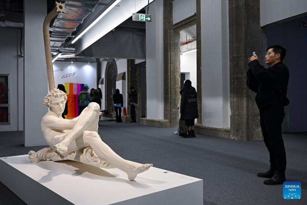 A visitor takes a photo of a sculpture during an exhibition at the historical building of Shanghai Municipal Council in east China's Shanghai, Jan. 9, 2025. In recent years, Shanghai has been promoting the construction of key public cultural facilities and cultural landmarks with Shanghai characteristics.