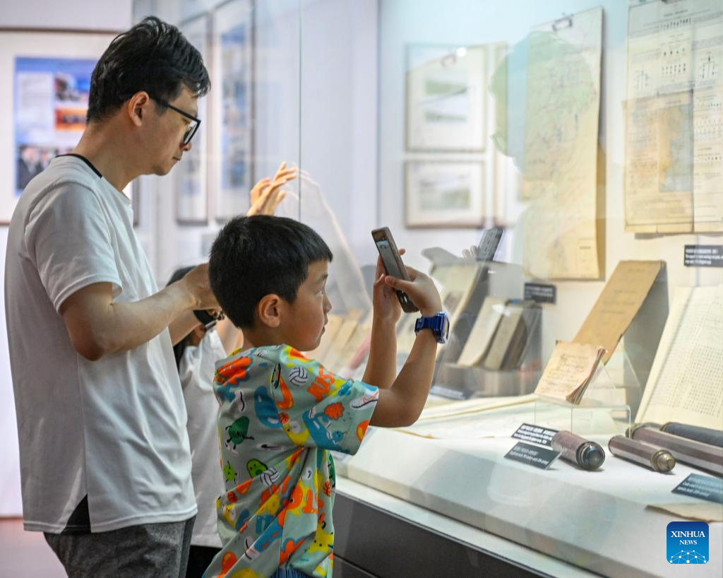 A boy takes a photo of exhibits at the Shanghai Meteorological Museum in east China's Shanghai, May 17, 2025. In recent years, Shanghai has been promoting the construction of key public cultural facilities and cultural landmarks with Shanghai characteristics.