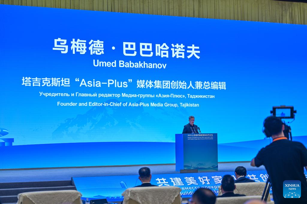 Umed Babakhanov, Founder and Editor-in-Chief of Asia-Plus Media Group of Tajikistan, speaks at the 2025 Media Cooperation Forum of SCO Countries held in Urumqi, northwest China's Xinjiang Uygur Autonomous Region, May 23, 2025. With the theme of "Building a Better Home Together for a Prosperous Future," the forum kicked off in Urumqi of Xinjiang on Friday. Over 300 representatives from mainstream media outlets, government departments, academic institutions, and enterprises from 26 SCO member states, observer states, and dialogue partners attended the forum. (Xinhua/Ding Lei)