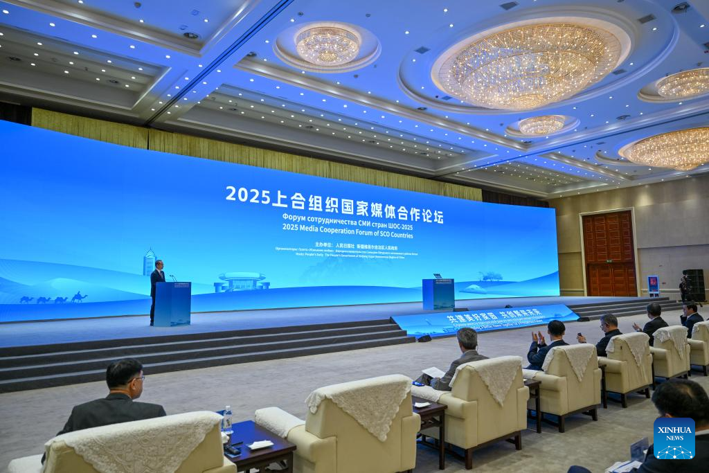 Yu Shaoliang, President of People's Daily, delivers a speech at the opening ceremony of the 2025 Media Cooperation Forum of SCO Countries held in Urumqi, northwest China's Xinjiang Uygur Autonomous Region, May 23, 2025. With the theme of "Building a Better Home Together for a Prosperous Future," the forum kicked off in Urumqi of Xinjiang on Friday. Over 300 representatives from mainstream media outlets, government departments, academic institutions, and enterprises from 26 SCO member states, observer states, and dialogue partners attended the forum. (Xinhua/Ding Lei)