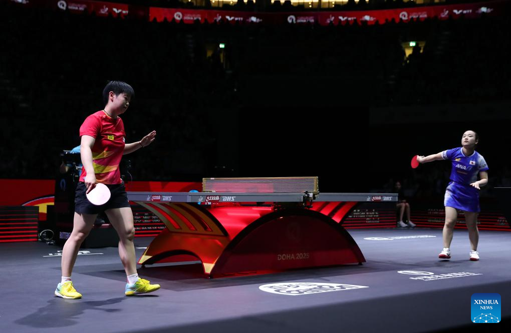 Sun Yingsha (L) hits a return during the women's singles semifinal between Sun Yingsha of China and Ito Mima of Japan at ITTF World Table Tennis Championships Finals Doha 2025 in Doha, Qatar, May 24, 2025. (Xinhua/He Changshan)