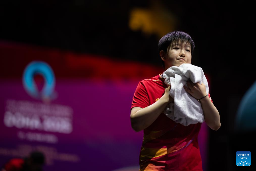 Sun Yingsha hits a return during the women's singles semifinal between Sun Yingsha of China and Ito Mima of Japan at ITTF World Table Tennis Championships Finals Doha 2025 in Doha, Qatar, May 24, 2025. (Xinhua/Liu Xu)