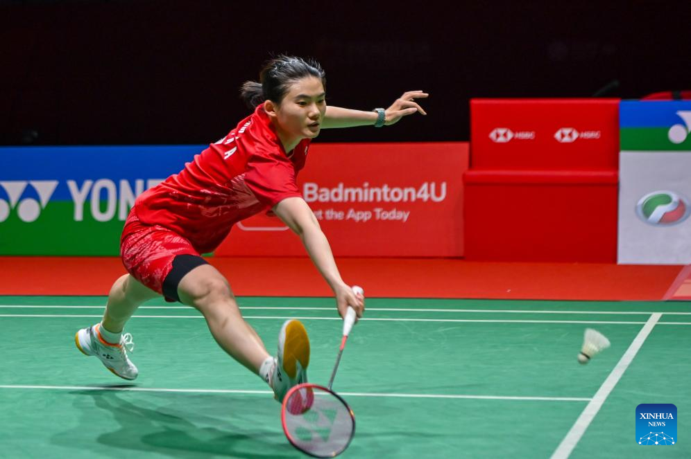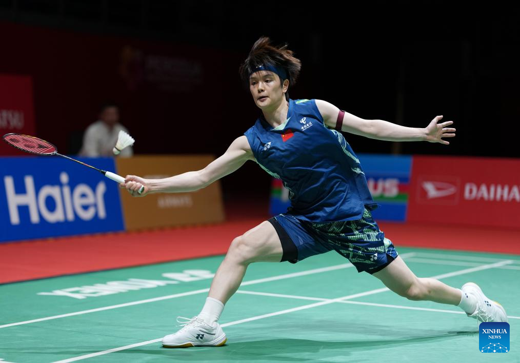 Wang Zhiyi of China hits a return during the women's singles semifinal match between Wang Zhiyi of China and Ratchanok Intanon of Thailand at Malaysia Masters 2025 in Kuala Lumpur, Malaysia, May 24, 2025. (Xinhua/Jia Haocheng)