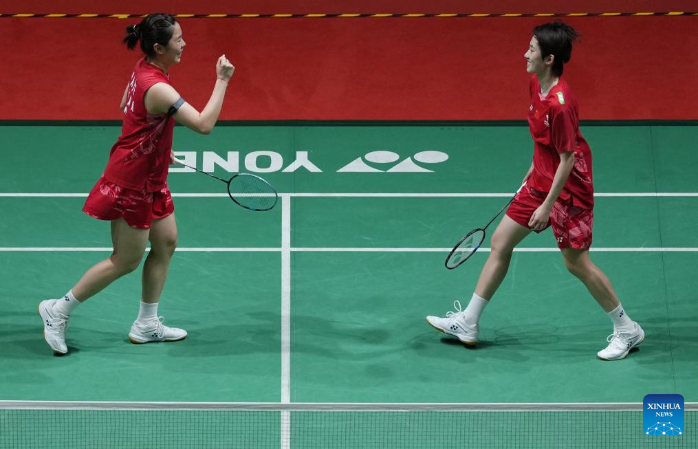 Jia Yifan (L)/Zhang Shuxian celebrate scoring the women's doubles semifinal between Jia Yifan/Zhang Shuxian of China and Pearly Tan/Thinaah Muralitharan of Malaysia at 2025 Malaysia Masters badminton tournament in Kuala Lumpur, Malaysia, May 24, 2025. (Xinhua/Jia Haocheng)