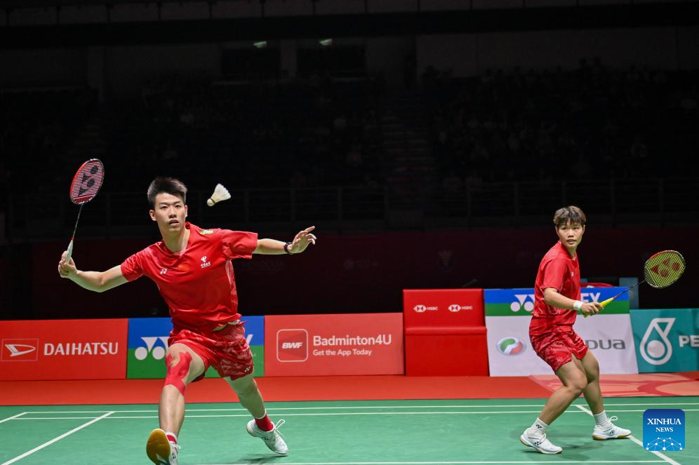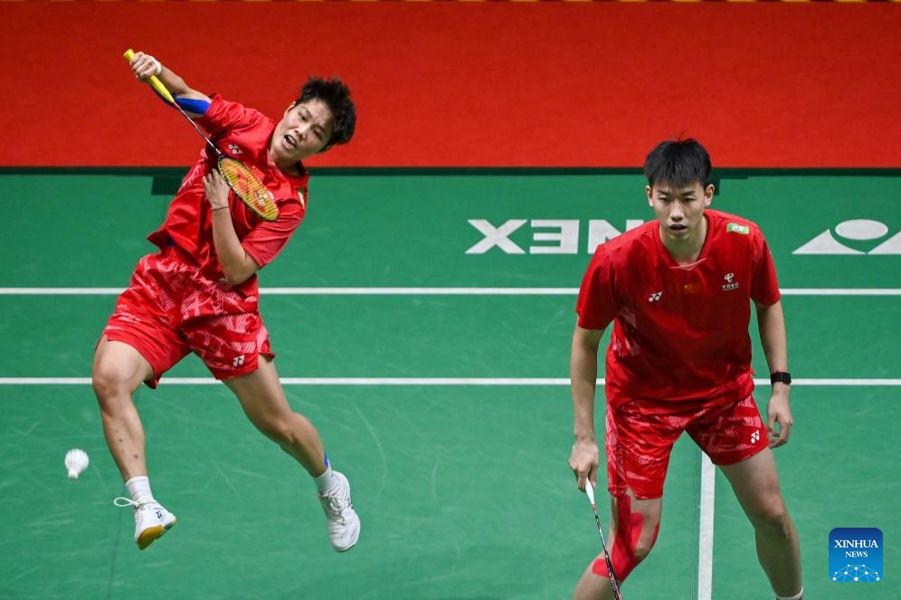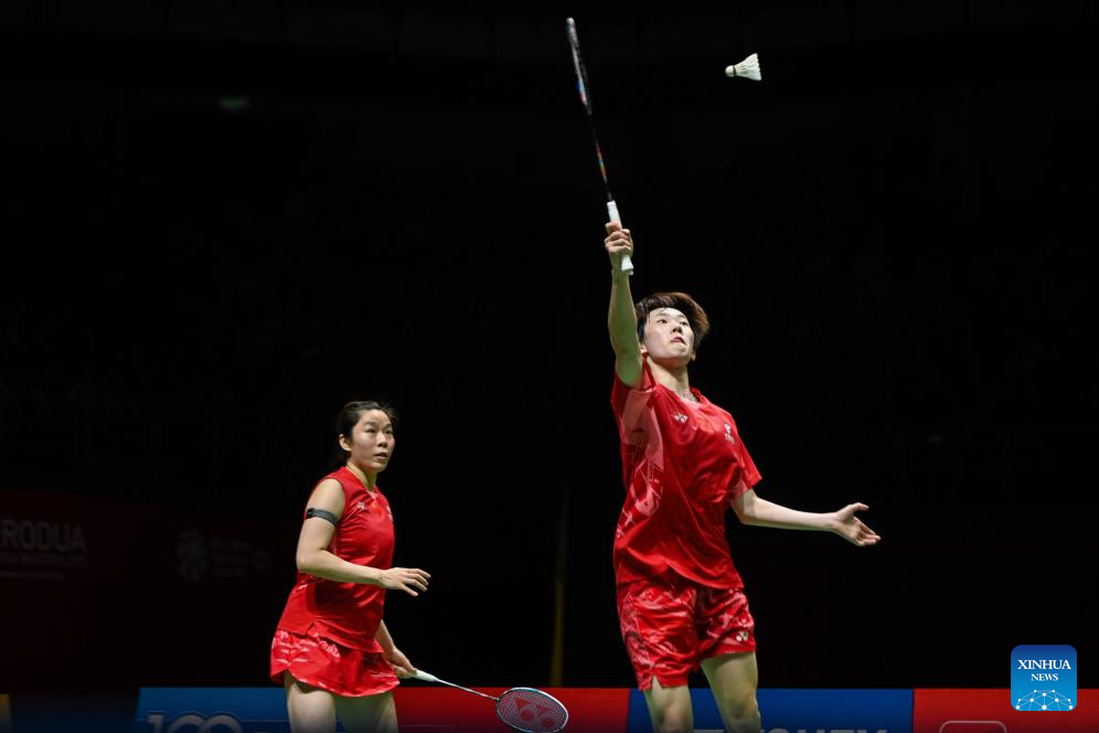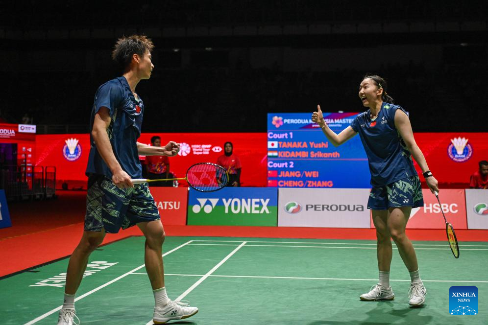 Cheng Xing (R)/Zhang Chi of China compete during the mixed doubles semifinal between Jiang Zhenbang/Wei Yaxin of China and Cheng Xing/Zhang Chi of China at the Malaysia Masters 2025 badminton tournament in Kuala Lumpur, Malaysia, May 24, 2025. (Photo by Chong Voon Chung/Xinhua)