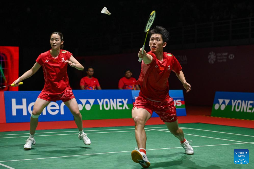 Feng Yanzhe/Huang Dongping (L) compete during the mixed doubles semifinal between Feng Yanzhe/Huang Dongping of China and Ye Hong Wei/Nicole Gonzales Chan of Chinese Taipei at the Malaysia Masters 2025 badminton tournament in Kuala Lumpur, Malaysia, May 24, 2025. (Photo by Chong Voon Chung/Xinhua)