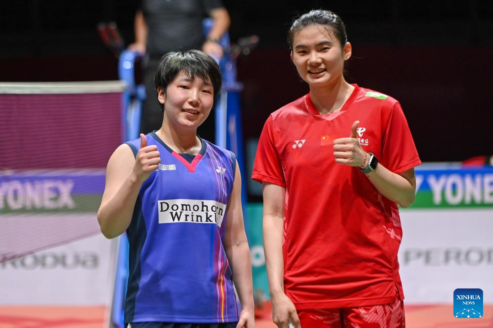 Han Yue (R) of China and Yamaguchi Akane of Japan pose after their women's singles semifinal at the Malaysia Masters 2025 badminton tournament in Kuala Lumpur, Malaysia, May 24, 2025. (Photo by Chong Voon Chung/Xinhua)