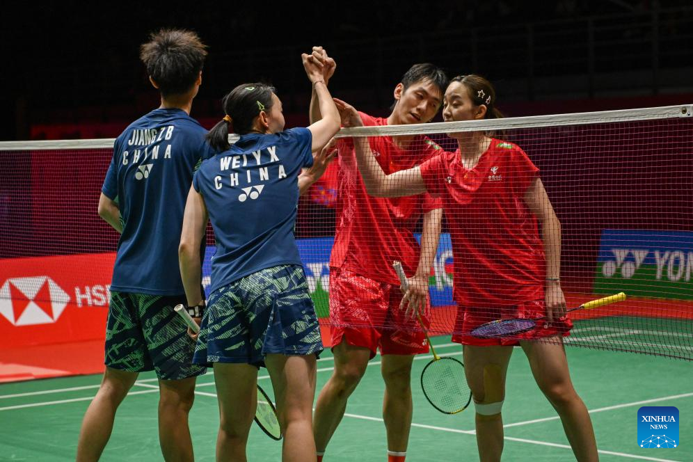 Mixed doubles duo Feng Yanzhe/Huang Dongping shattered Ye Hong Wei/Nicole Gonzales Chan of Chinese Taipei 21-10, 21-7, while Jiang Zhenbang/Wei Yaxin knocked out compatriots Cheng Xing/Zhang Chi 15-21, 22-20, 21-19.
