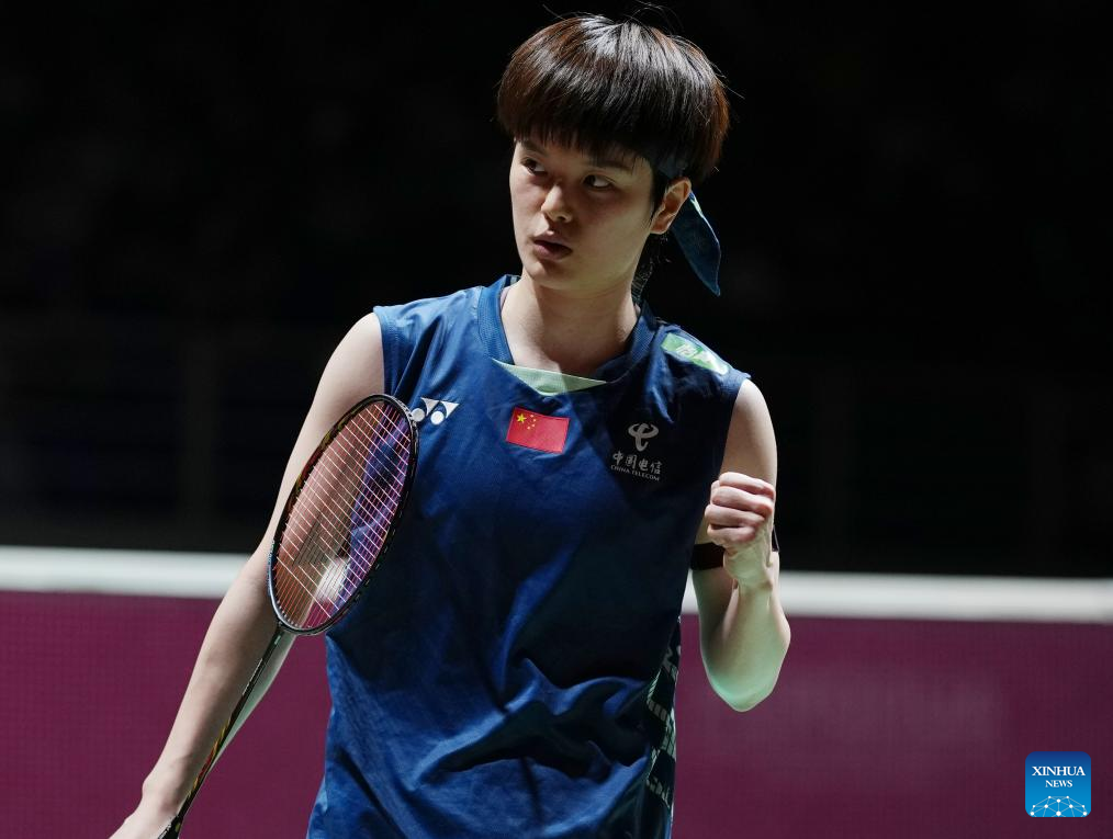 Wang Zhiyi of China celebrates a point during the women's singles semifinal match between Wang Zhiyi of China and Ratchanok Intanon of Thailand at Malaysia Masters 2025 in Kuala Lumpur, Malaysia, May 24, 2025. (Xinhua/Jia Haocheng)