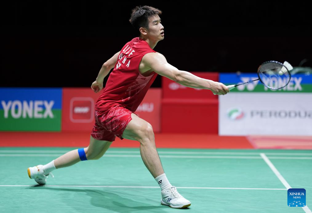 Li Shifeng hits a return during the men's singles semifinal match between Li Shifeng of China and Naraoka Kodai of Japan at Malaysia Masters 2025 in Kuala Lumpur, Malaysia, May 24, 2025. (Xinhua/Jia Haocheng)