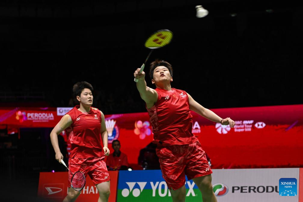Jia Yifan (R)/Zhang Shuxian compete during the women's doubles semifinal between Jia Yifan/Zhang Shuxian of China and Pearly Tan/Thinaah Muralitharan of Malaysia at 2025 Malaysia Masters badminton tournament in Kuala Lumpur, Malaysia, May 24, 2025. (Xinhua/Jia Haocheng)