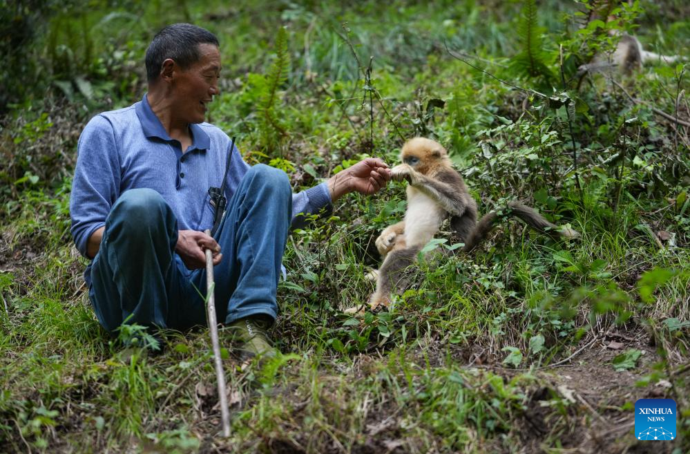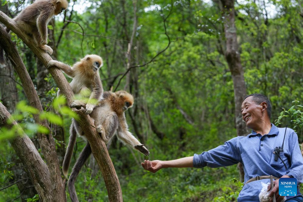 Xu Tingyou feeds Sichuan golden snub-nosed monkeys in the Pingwu Sichuan golden snub-nosed monkey popular science education base in Pingwu County, Mianyang City of southwest China's Sichuan Province, May 21, 2025. Located within the Xiaohegou Nature Reserve, a provincial-level nature reserve in Sichuan Province, Pingwu Sichuan golden snub-nosed monkey popular science education base is home to over 40 Sichuan golden snub-nosed monkeys. According to the latest monitoring data of 2024, Xiaohegou Nature Reserve is the habitat of about 1,000 Sichuan golden snub-nosed monkeys.