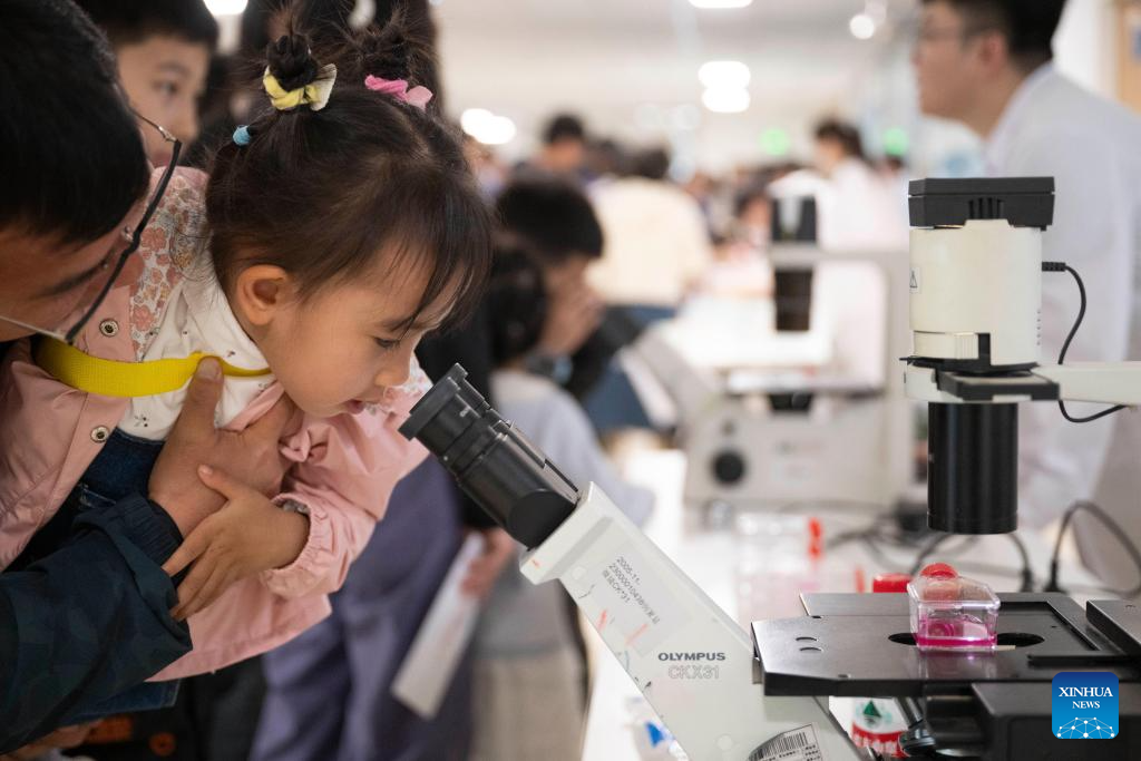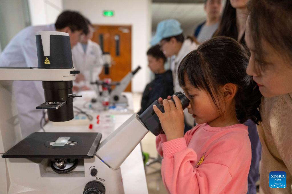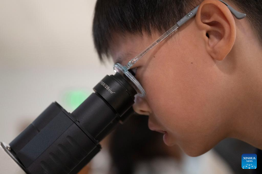 A child looks through a microscope during an open day of the Harbin Veterinary Research Institute in Harbin, capital of northeast China's Heilongjiang Province, May 24, 2025. The Harbin Veterinary Research Institute under the Chinese Academy of Agricultural Sciences held an open day of popular science activities on Saturday. (Xinhua/Zhang Tao)