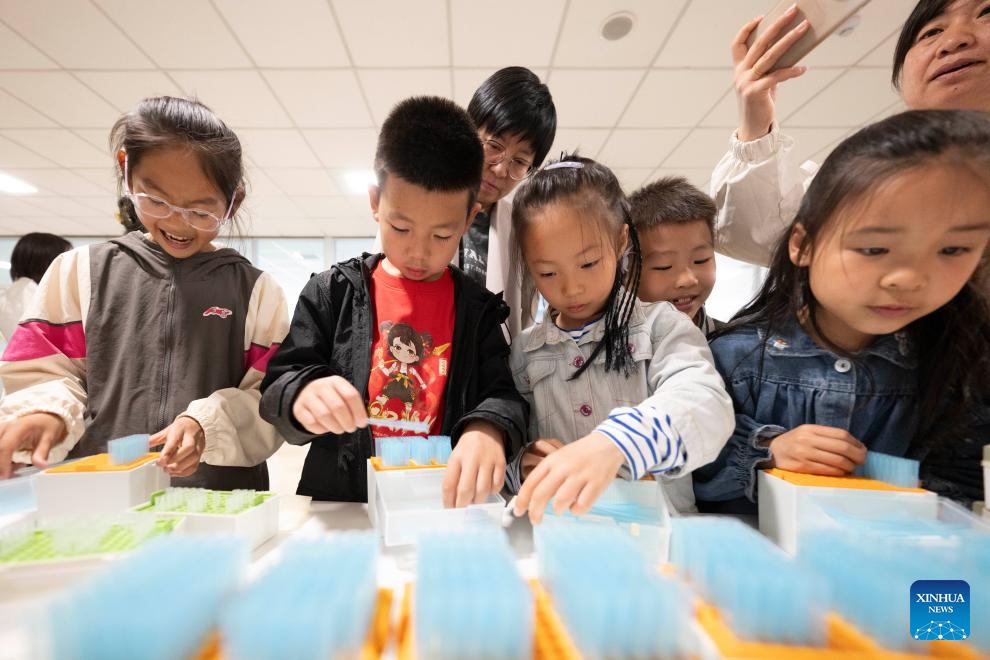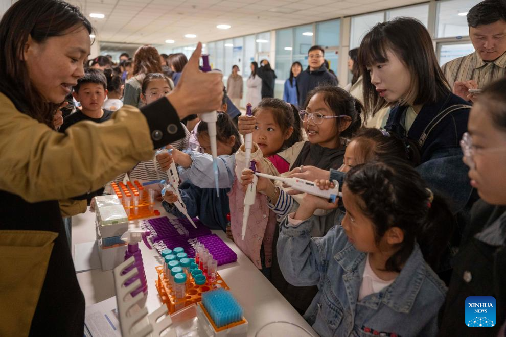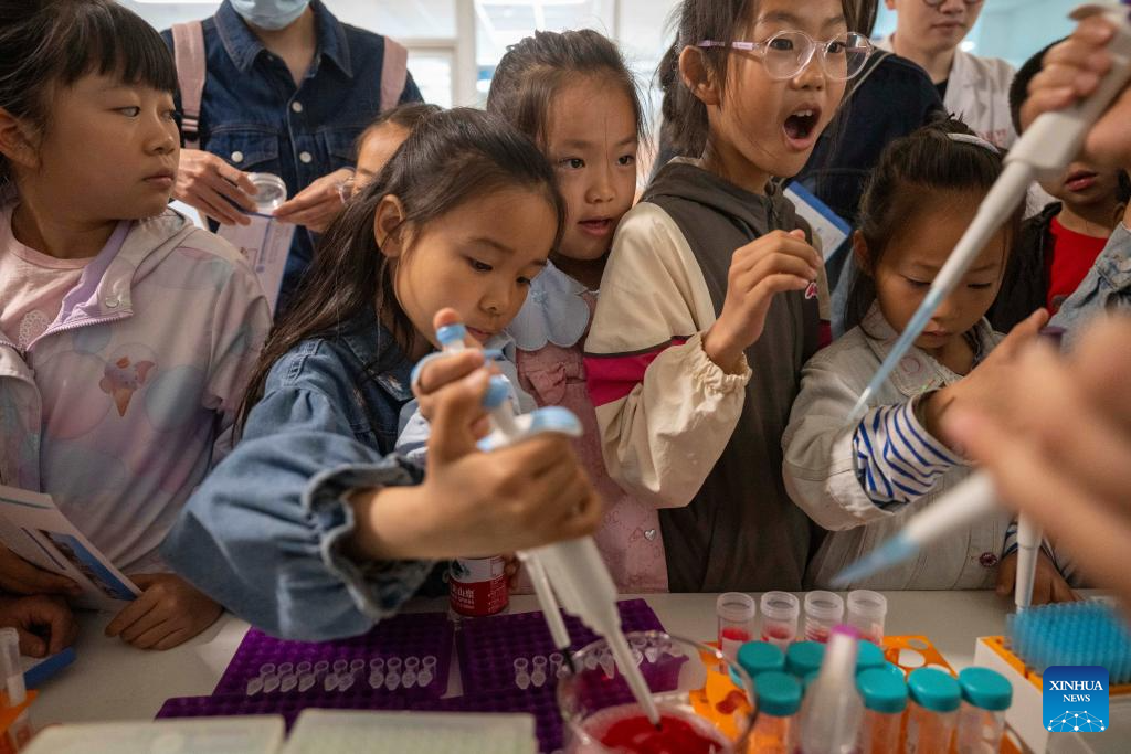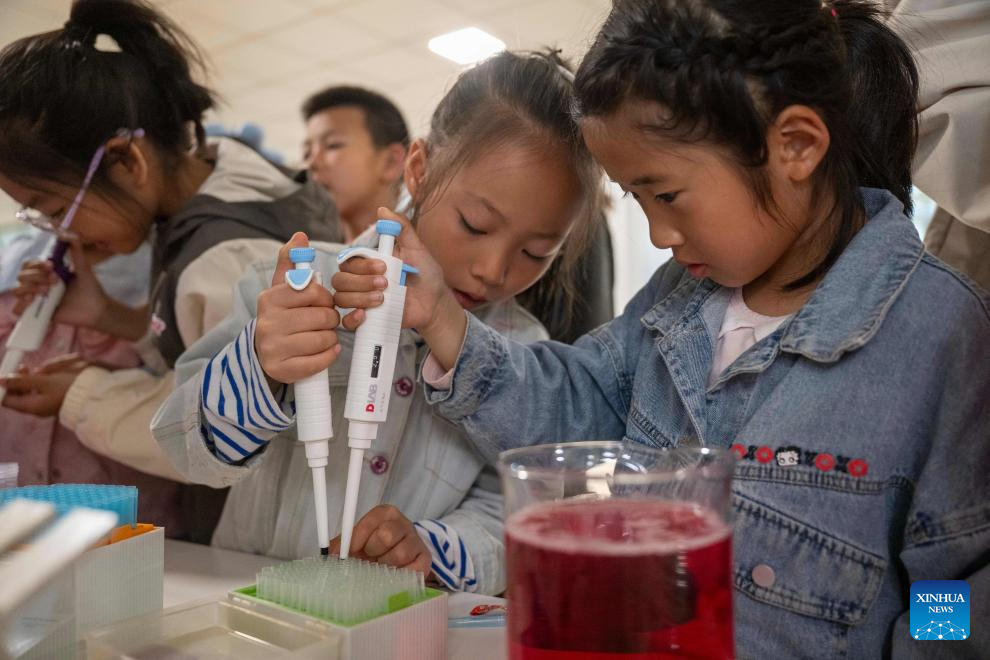Children experience experimental equipment during an open day of the Harbin Veterinary Research Institute in Harbin, capital of northeast China's Heilongjiang Province, May 24, 2025. The Harbin Veterinary Research Institute under the Chinese Academy of Agricultural Sciences held an open day of popular science activities on Saturday. (Xinhua/Zhang Tao)