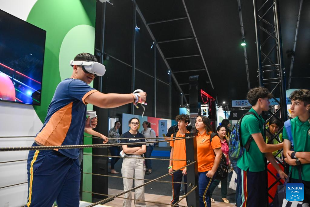 A student tries VR glasses at the third edition of the Public Service Expo in Ta' Qali, Attard, Malta, on May 23, 2025. The third edition of the Public Service Expo is being held at the Malta Fairs and Conventions Center in Ta' Qali. The five-day event, which kicked off on Wednesday, will run until Sunday. (Photo by Jonathan Borg/Xinhua)
