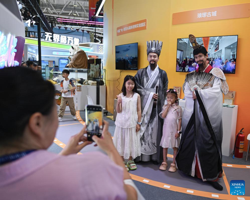 Children pose for a photo with models at the exhibition area of Shandong Province during the 21st China (Shenzhen) International Cultural Industries Fair in Shenzhen, south China's Guangdong Province, May 24, 2025. Opened here on Thursday, the five-day event is being held across eight exhibition halls -- three comprehensive spaces and five specialized areas. Activities related to traditional culture and cultural heritages attracted many young visitors. (Xinhua/Xiao Ennan)