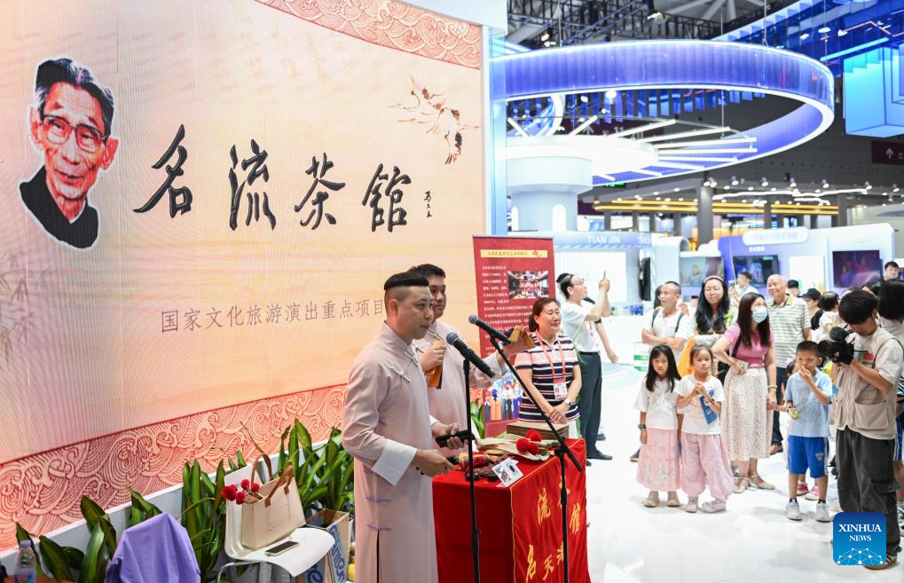 Visitors watch a clapper talk show at the exhibition area of Tianjin during the 21st China (Shenzhen) International Cultural Industries Fair in Shenzhen, south China's Guangdong Province, May 24, 2025. Opened here on Thursday, the five-day event is being held across eight exhibition halls -- three comprehensive spaces and five specialized areas. Activities related to traditional culture and cultural heritages attracted many young visitors. (Xinhua/Xiao Ennan)