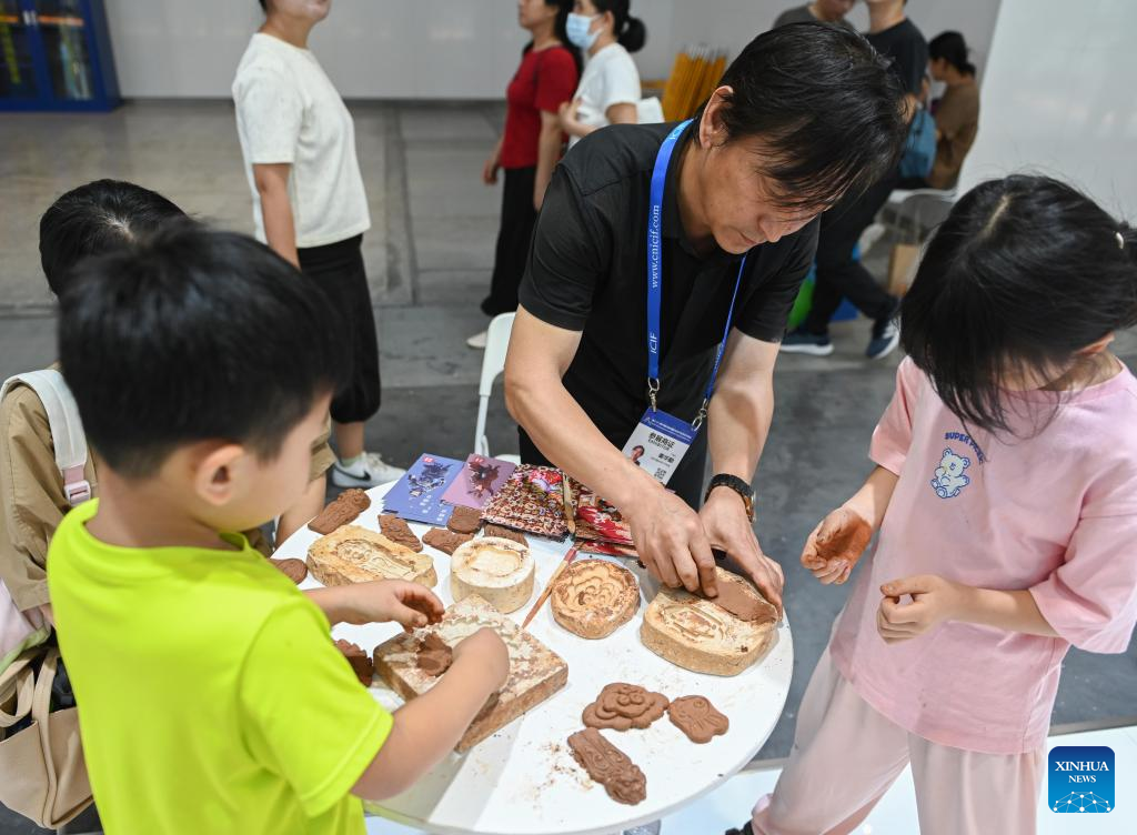 An artist teaches children to make clay sculptures at the exhibition area of Shanxi Province during the 21st China (Shenzhen) International Cultural Industries Fair in Shenzhen, south China's Guangdong Province, May 24, 2025. Opened here on Thursday, the five-day event is being held across eight exhibition halls -- three comprehensive spaces and five specialized areas. Activities related to traditional culture and cultural heritages attracted many young visitors. (Xinhua/Xiao Ennan)