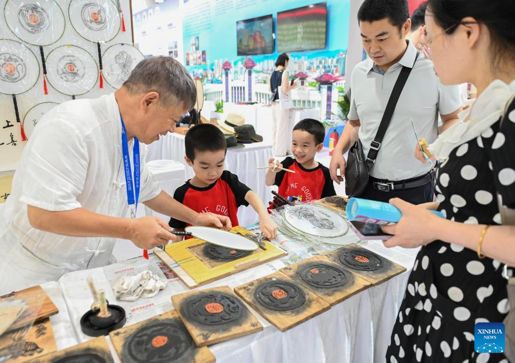 Children experience a traditional Chinese printing skill at the exhibition area of Jiangxi Province during the 21st China (Shenzhen) International Cultural Industries Fair in Shenzhen, south China's Guangdong Province, May 24, 2025. Opened here on Thursday, the five-day event is being held across eight exhibition halls -- three comprehensive spaces and five specialized areas. Activities related to traditional culture and cultural heritages attracted many young visitors. (Xinhua/Xiao Ennan)