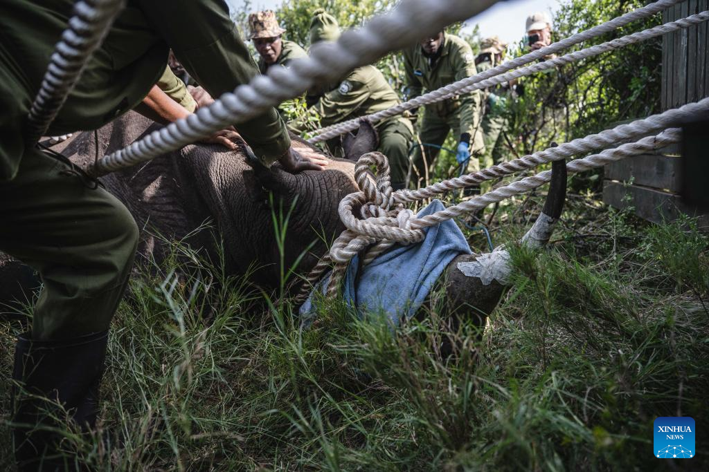 Members of the Kenya Wildlife Service (KWS) examine a black rhino at Ol Pejeta Conservancy in Laikipia, Kenya, on May 24, 2025. (Xinhua/Wang Guansen)