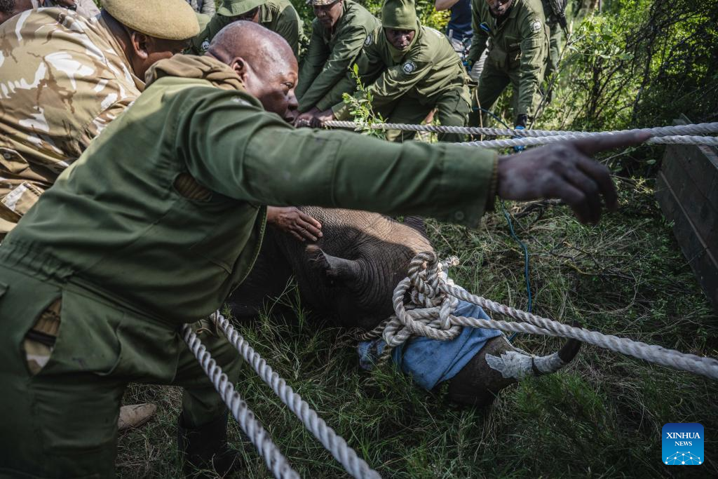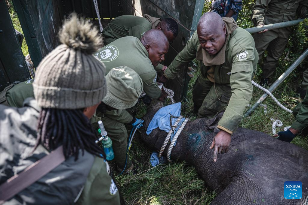 Members of the Kenya Wildlife Service (KWS) move a tranquilized black rhino during a translocation exercise at Ol Pejeta Conservancy in Laikipia, Kenya, on May 24, 2025. (Xinhua/Wang Guansen)