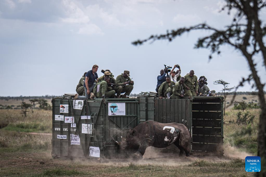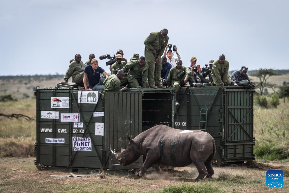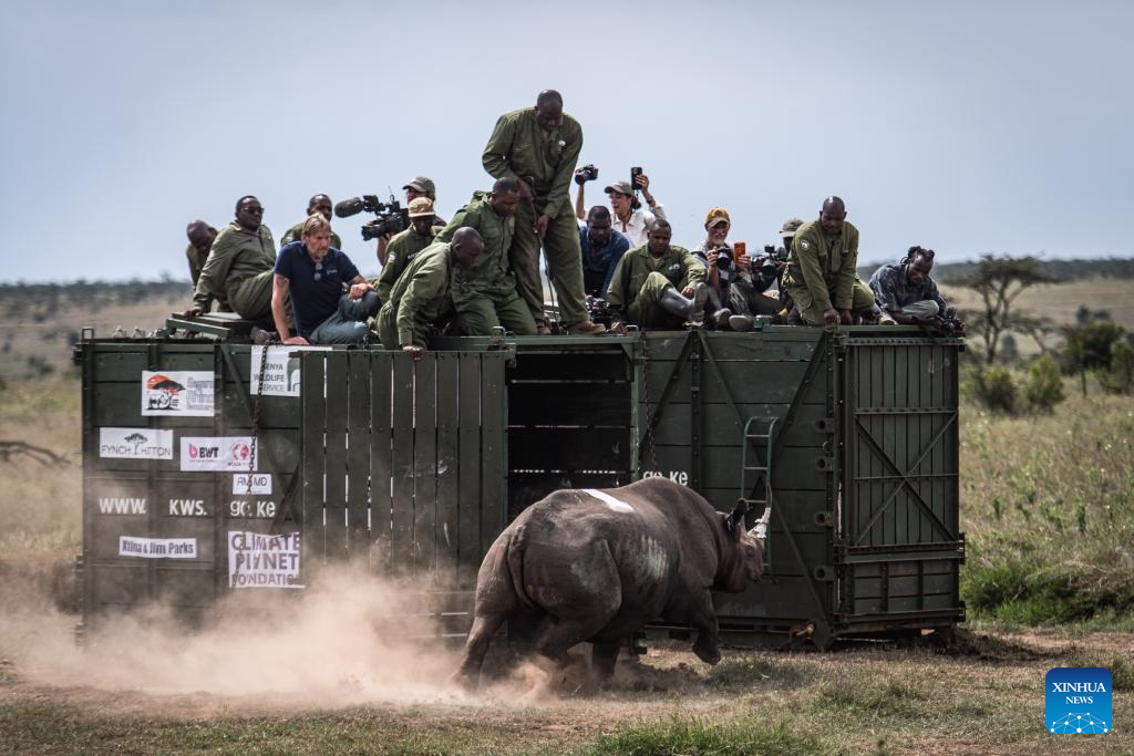 Members of the Kenya Wildlife Service (KWS) release a relocated black rhino at Segera Conservancy in Laikipia, Kenya, on May 24, 2025. (Xinhua/Wang Guansen)
